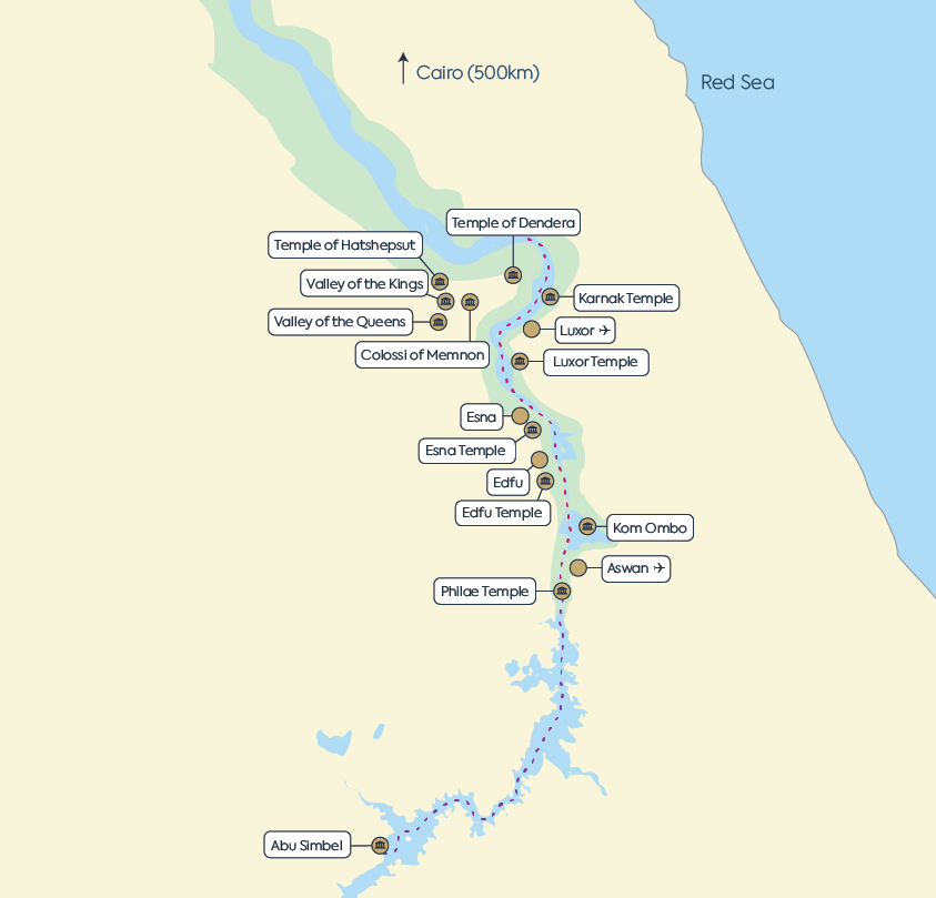 The Abu Simbel Temples are among Egypt’s most iconic monuments and can be included as an optional excursion from Aswan. Constructed by Ramses II and carved into a rock face, the temples are renowned for their enormous statues and their remarkable relocation project, which was undertaken to protect them from flooding.