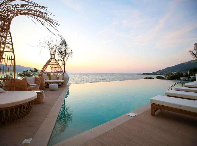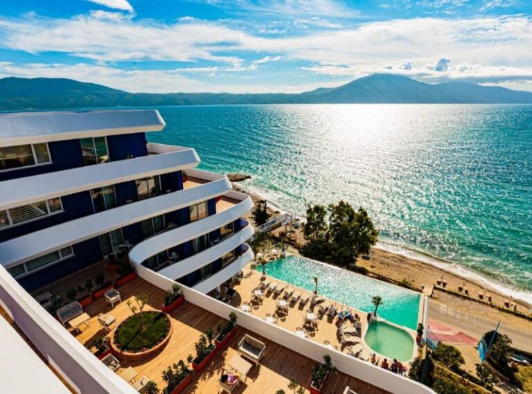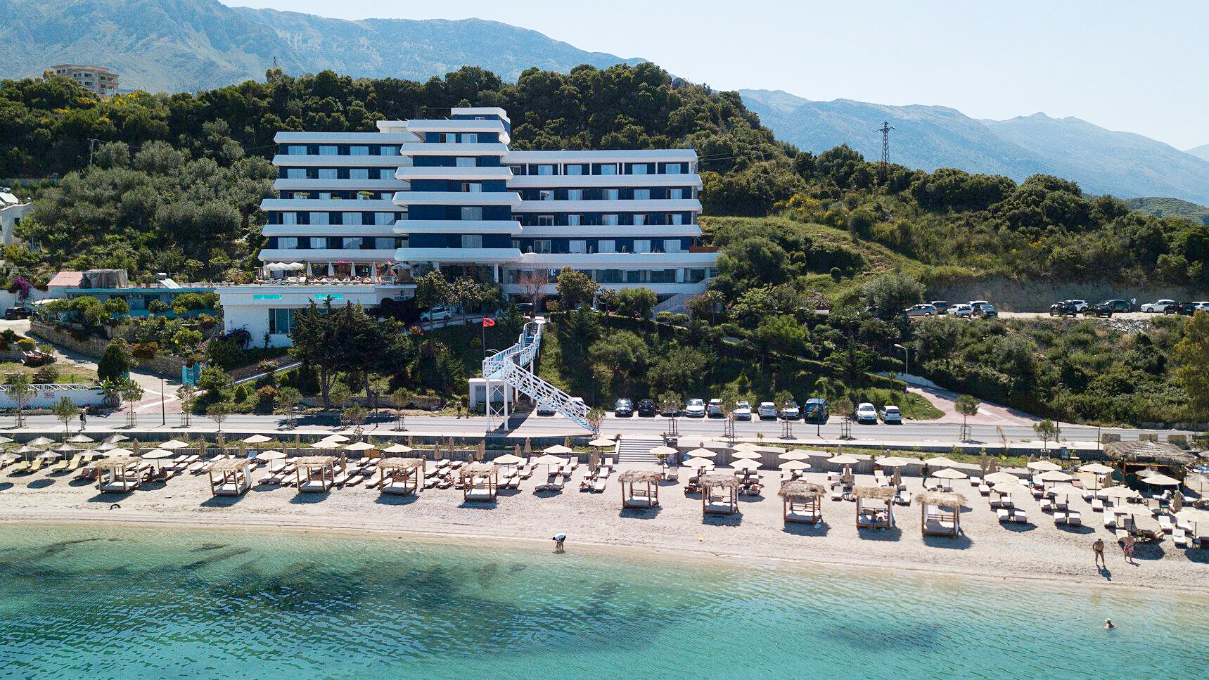 Regina Blu is a 5-star luxury hotel and a must-visit destination for beach lovers. The hotel has its own private beach along Vlora Bay, with sun loungers and parasols to help you relax and keep you safe from the suns rays. It is also a short walk from the town of Radhime, a quiet village that provides spectacular views of the Adriatic Sea and the surrounding mountains.