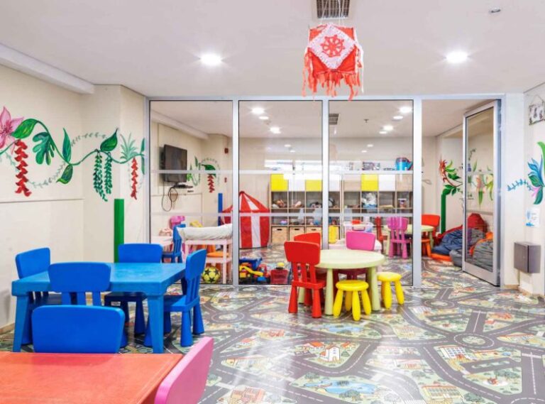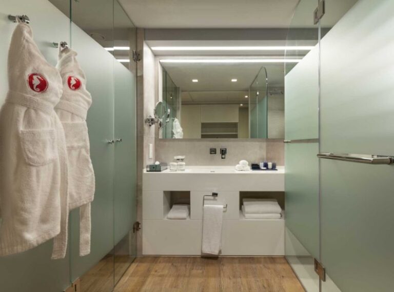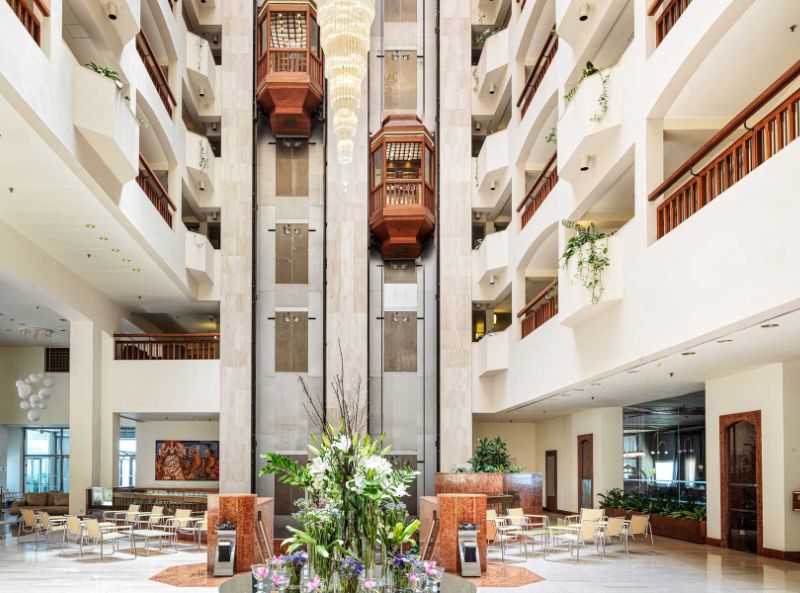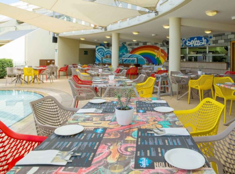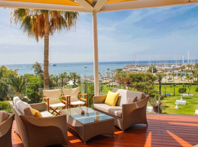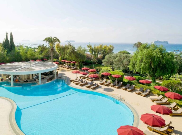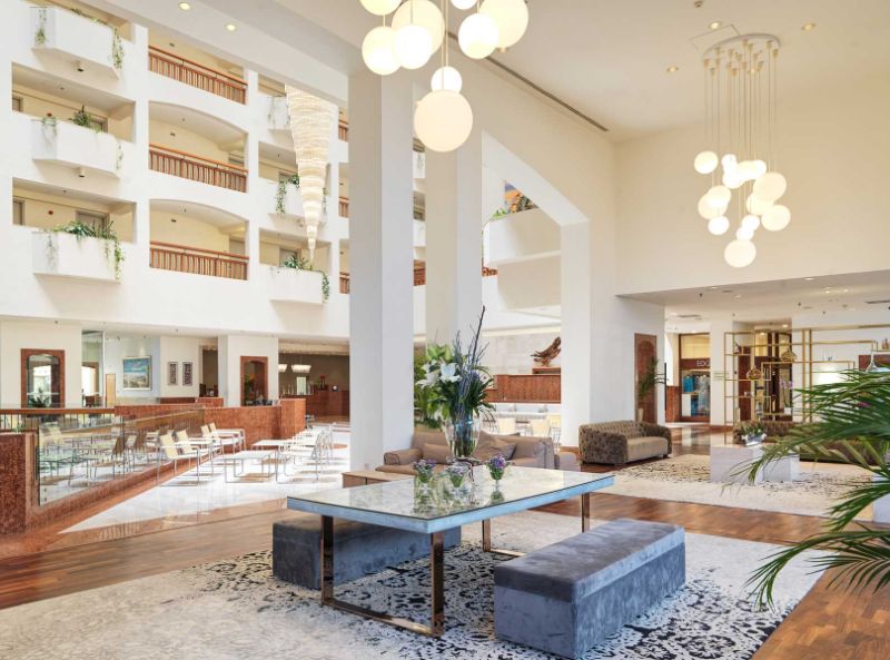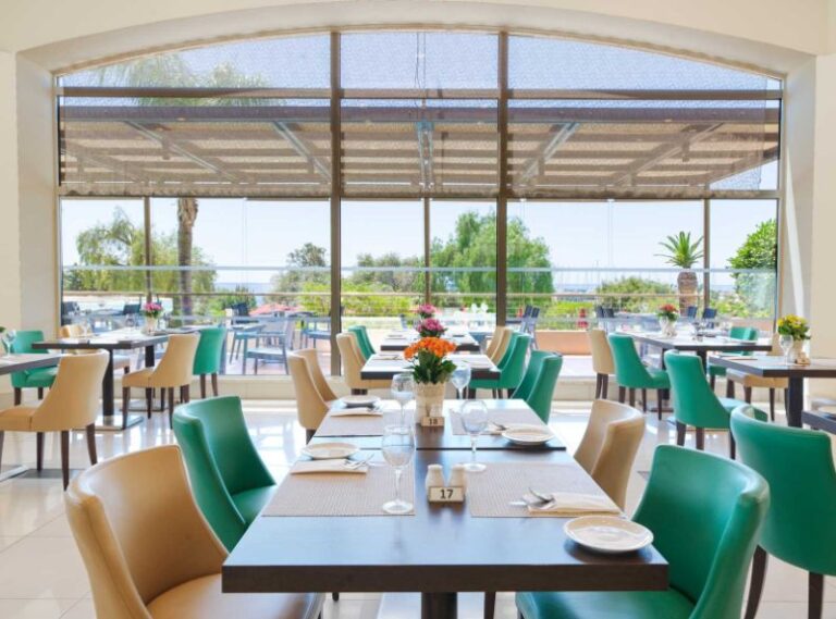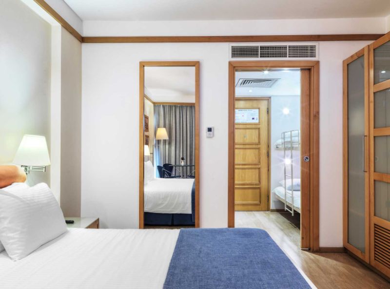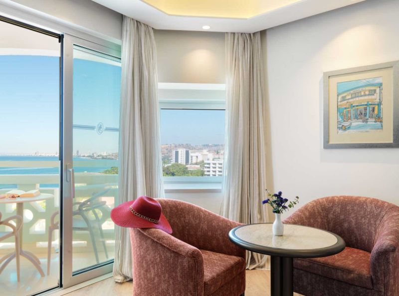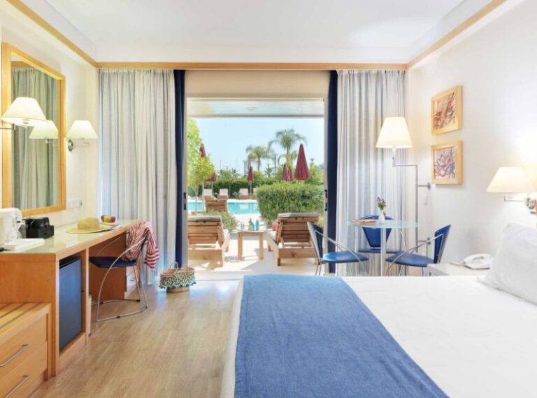 The hotel offers 272 rooms & suites all of which feature a private furnished balcony or terrace (except Inland View Rooms), heating/air conditioning, direct telephone, satellite flat screen 49” Smart TV, free mini bar (replenished every 7 nights stay for guests on All Inclusive), radio, tea & coffee facilities, bathrobe & slippers, safe deposit box, hair dryer & en-suite bathroom with full length bathtub. The hotel’s Executive Wing features 56 large bedrooms & modern facilities, with the main bedroom separating from the children’s area. Room categories include renovated Sea, Marina & Inland view, Executive Marina & Inland view, Family rooms to accommodate 2 adults and 3 children, Executive pool level, Admirals suites, Founders suite, Imperial Marina View & Presidential Suites.