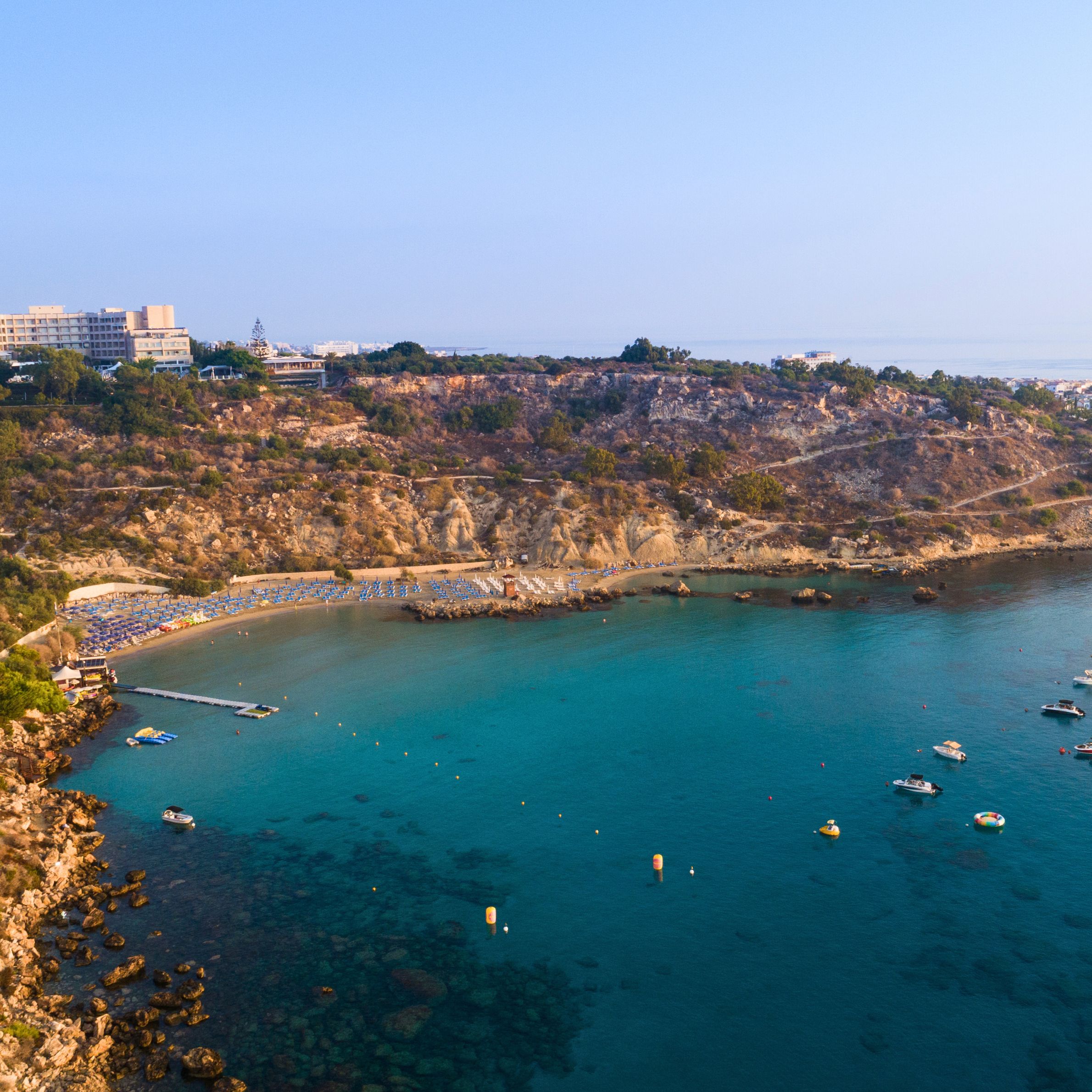 Protaras is a coastal resort on Cyprus’s south-eastern coast, renowned for its beautiful beaches and relaxed atmosphere. The town is situated approximately 10 km northeast of Ayia Napa and about 55 km from Larnaca, making it easily accessible via the island’s main international airport and coastal road network.