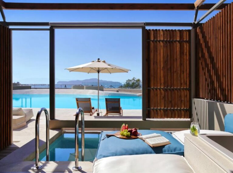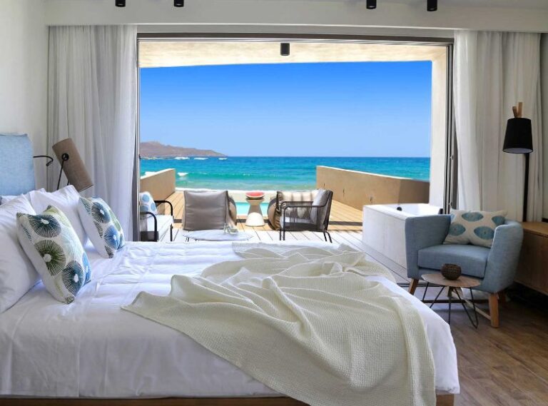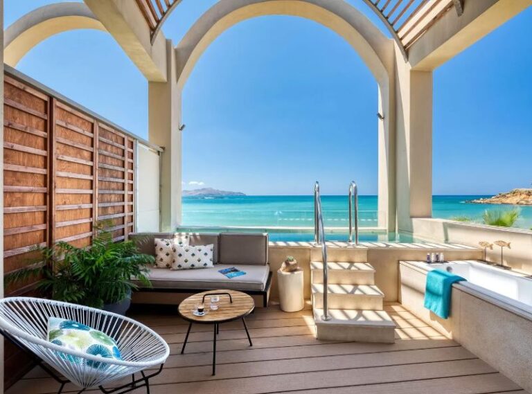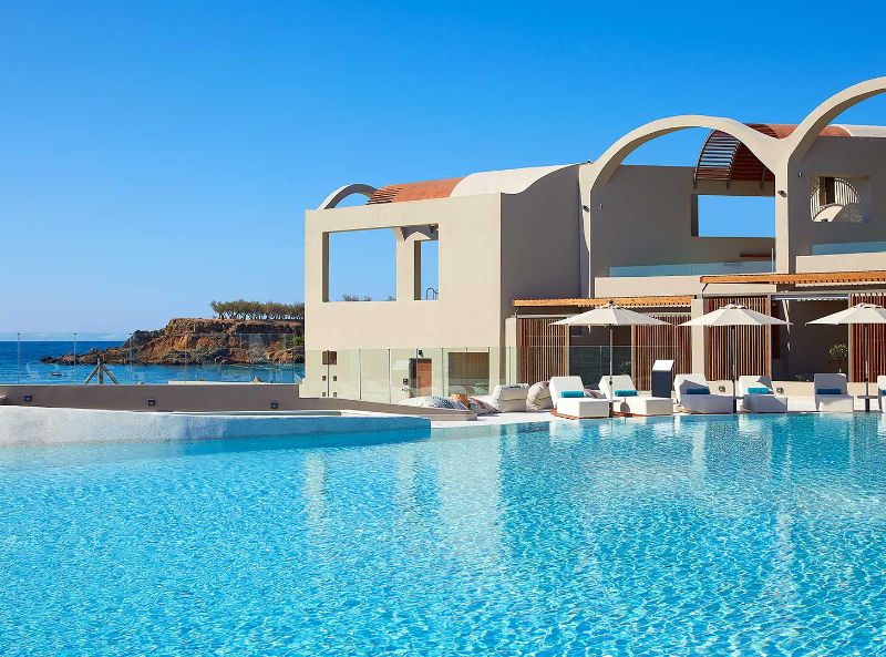 Designed and built to be a contemporary lifestyle resort, the exquisite Domes Noruz more than fulfils its purpose. The hotel is located in Agioi Apostoloi, a charming waterfront village just a few kilometres from the centre of Chania and is set directly on a gorgeous golden sandy beach. The hotel has an all day restaurant serving fine Cretan cuisine using local produce and a panoramic rooftop restaurant serving fresh sushi to enjoy with sensational sunset views. The N Bar serves up unique cocktail creations in a stylish lobby setting. There is also a luxurious spa and wellness centre to help guests further their state of relaxation. This stunning design-led hotel is an adult-only hotel boasting a vibrant and playful atmosphere with planned events and entertainment throughout the season. This is ideal for a romantic and luxurious Cretan getaway.