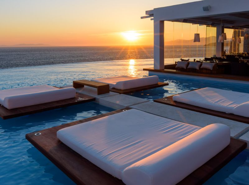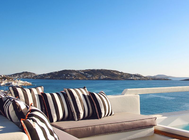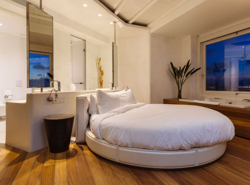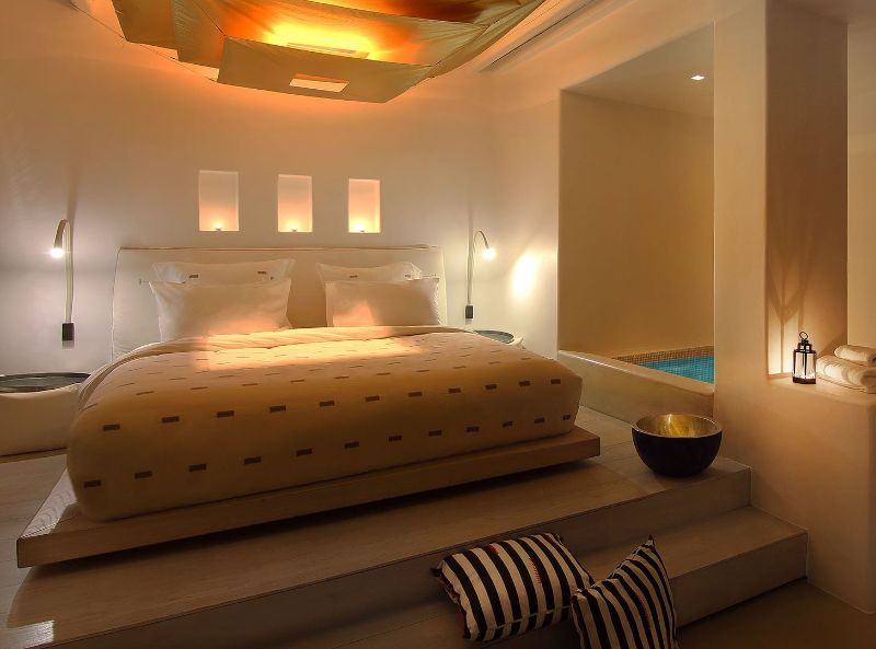 Rooms are spacious and equipped with individually controlled air-conditioning, bathrobe and slippers, internet access in rooms (free of charge) satellite flat screen TV, CD and DVD (only in Villas), alarm clock, telephones, safe box, mini bar, hair dryer. Premium Rooms come with a luxurious look and feel, featuring an open plan setting with a double bedroom with a queen size bed with stunning full sea views of the Aegean sea. Suites featuring a stylish four poster king sized bed and a separate sofa bed with a full sea view are located on the upper level. Maximum occupancy 3 persons.