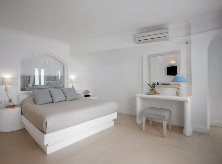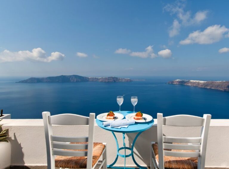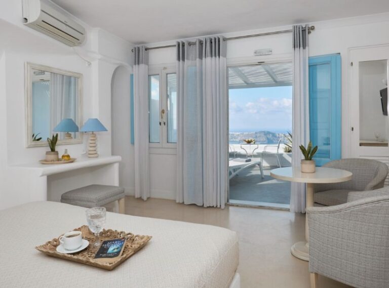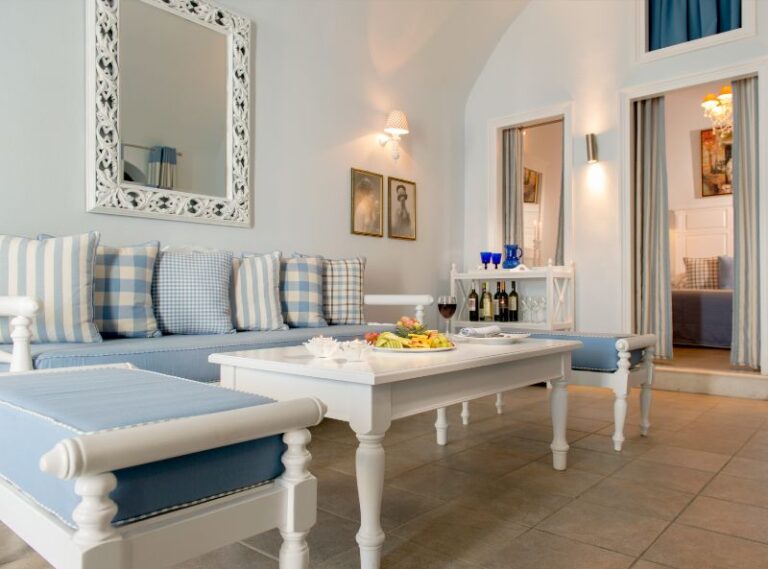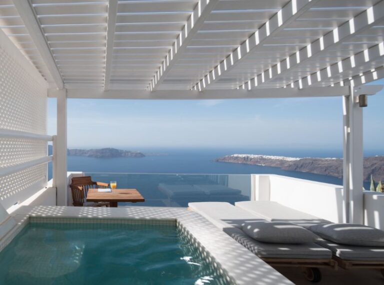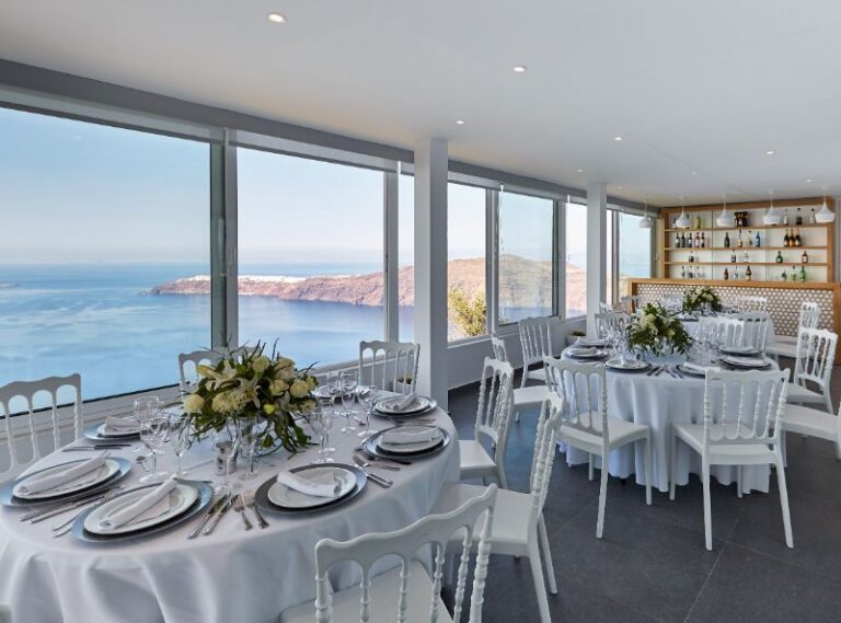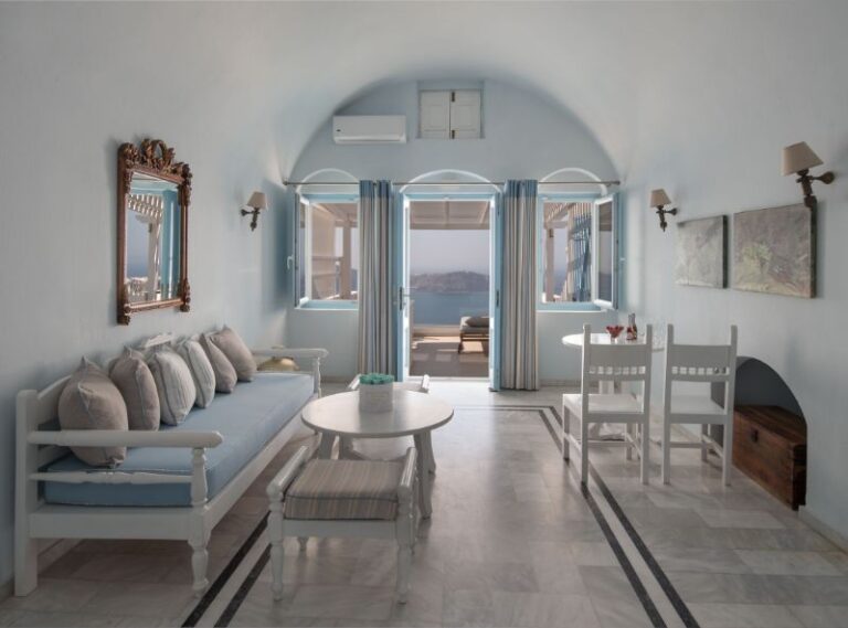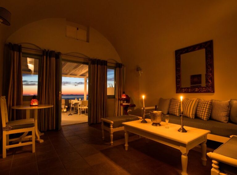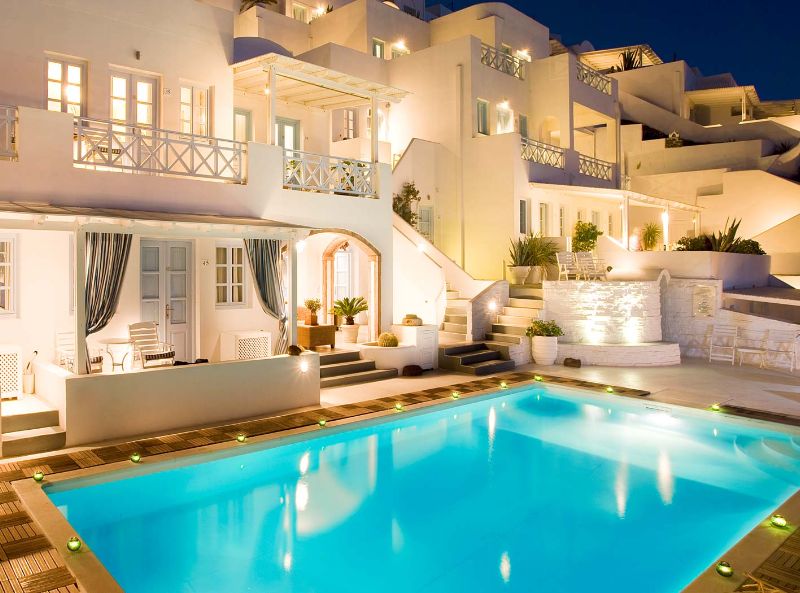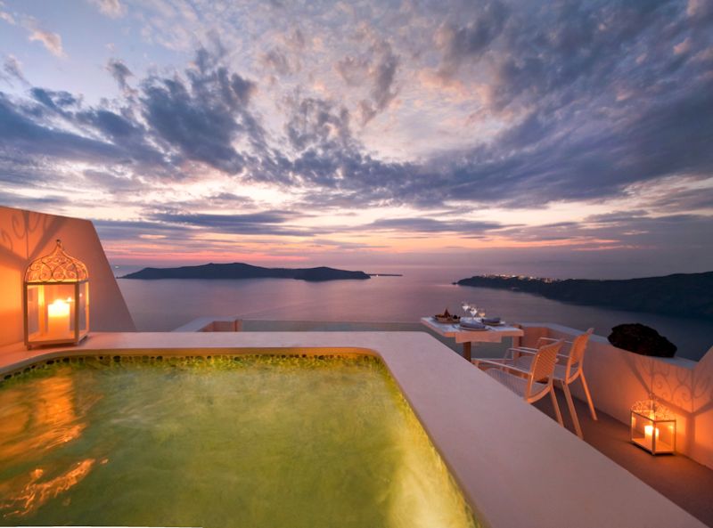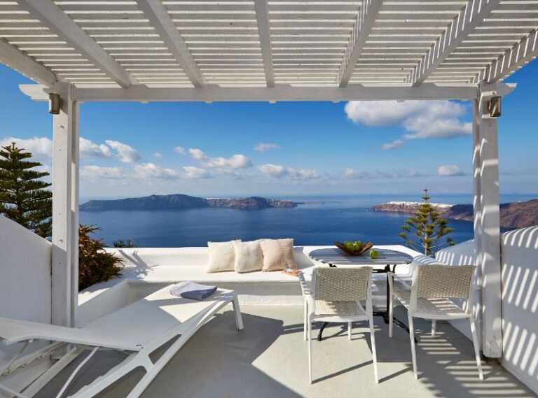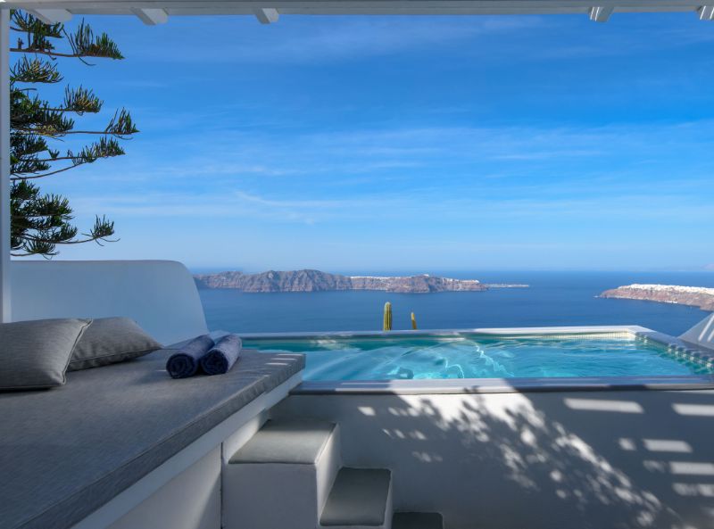 The Andromeda Villas are located in the scenic settlement of Imerovigli, in western Santorini, 300m above the Caldera. Set on a cliff-top with views across to the small volcanic islands of Palea, Nea and Thirassia, the hotel is a complex of traditionally-styled whitewashed buildings. It is just 2km from Fira town and 10km away from Santorini Airport.