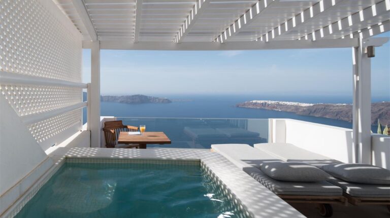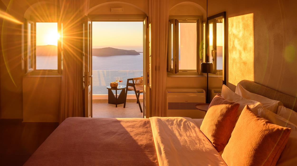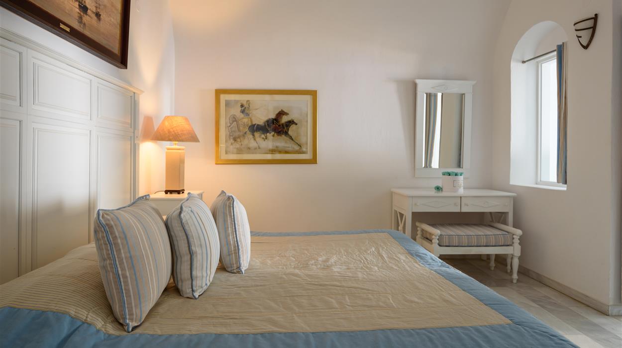 Classic Studios are air-conditioned and equipped with a bathroom with bathtub, hair dryer, a fully equipped kitchenette, refrigerator, direct dial telephone, satellite TV, radio, safe box, sitting area and a private furnished veranda or balcony with Caldera view. Suites have bathroom with shower and there is no kitchenette. Maximum occupancy 3 persons.