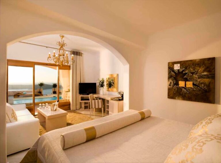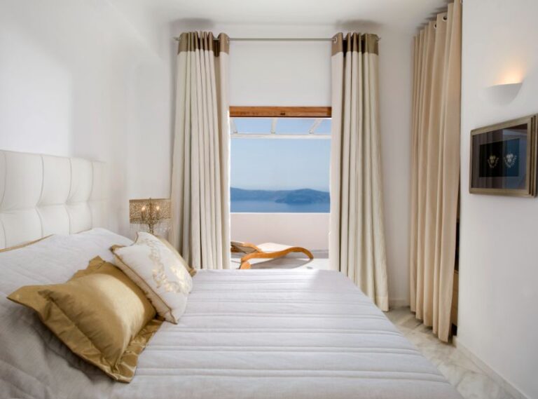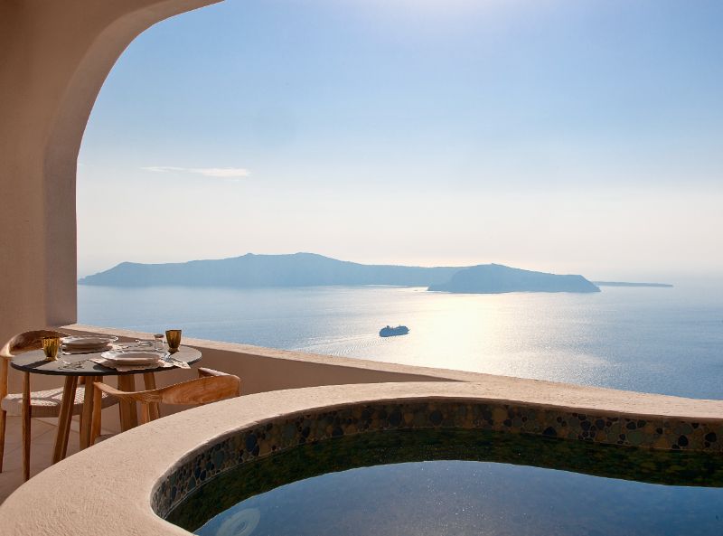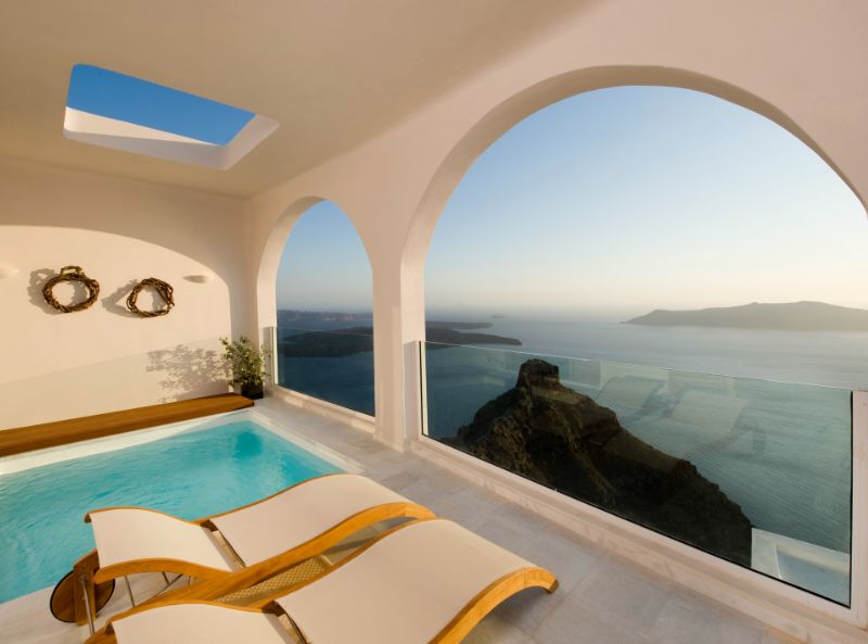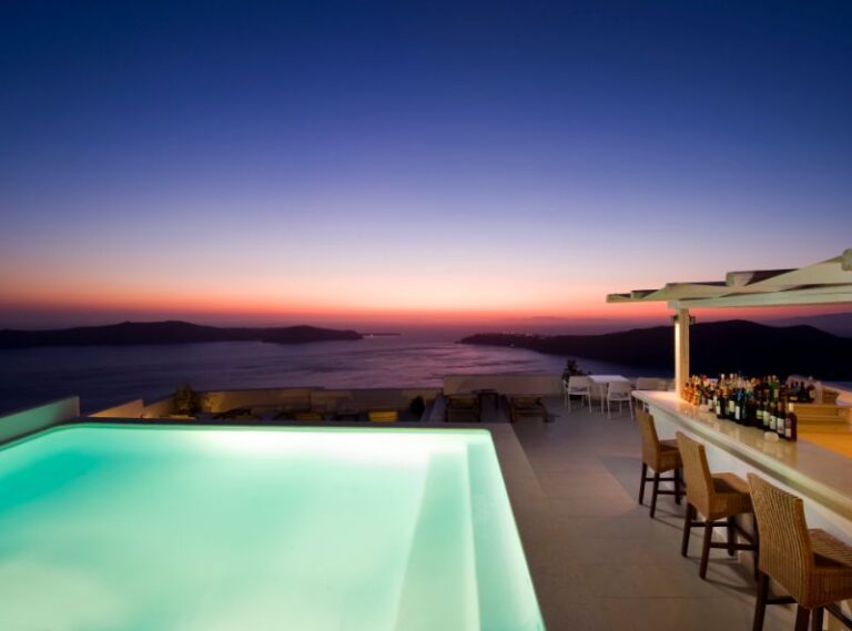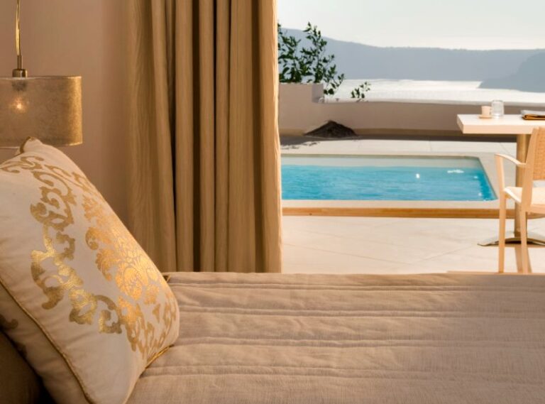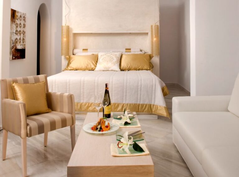 Set on the highest point in Imerovigli, 300 meters above the sea level, lying amidst the stunning volcanic scenery and with legendary sunsets where the deep blue sea meets the cloudless sky, Gold Suites is a sanctuary of romance. With stunning views of the caldera, legendary crimson sunsets, suites with private balconies, a pool bar and exquisite outdoor dining, this is the way to experience the beauty of the Aegean. Each of the 14 suites are wonderfully spacious with Gold and White décor that complements the Cycladic-style architecture.