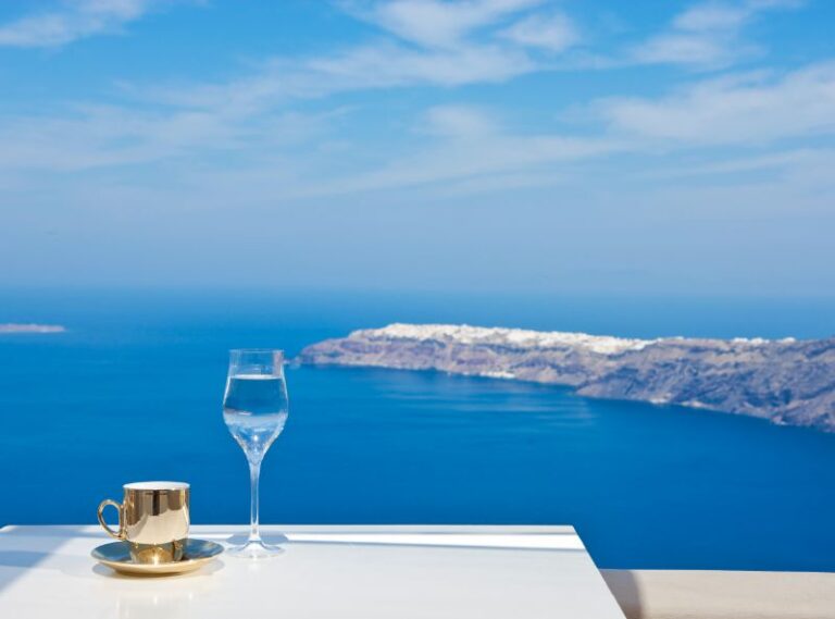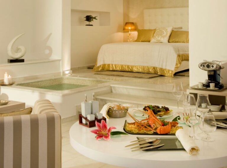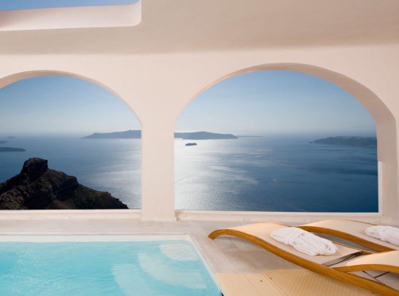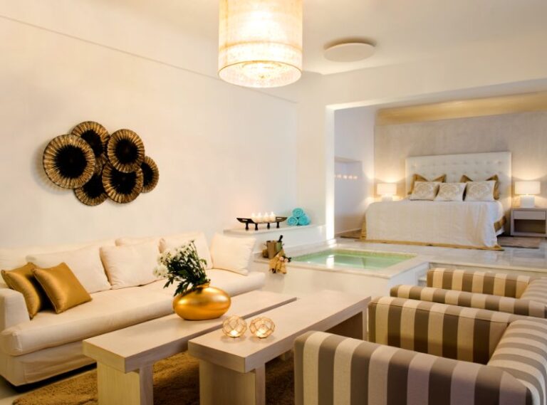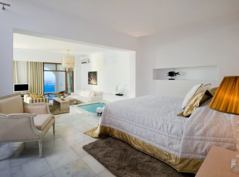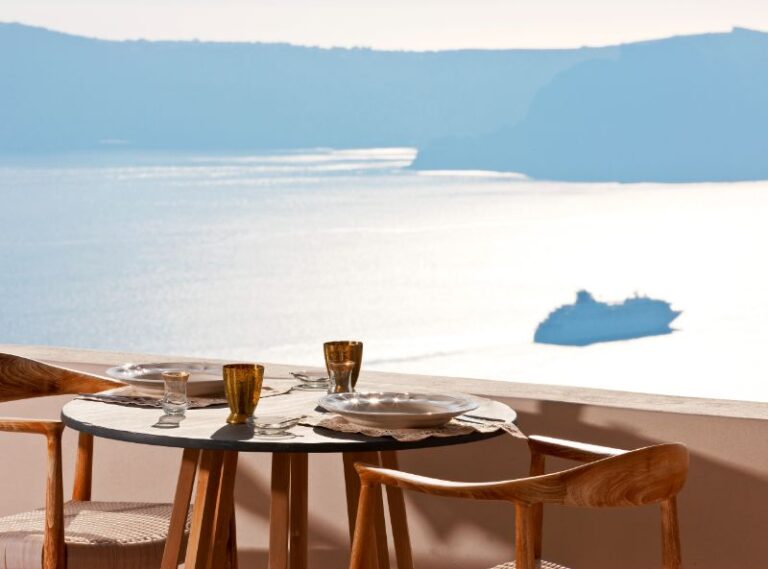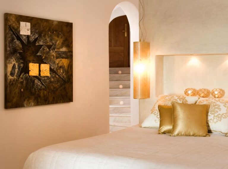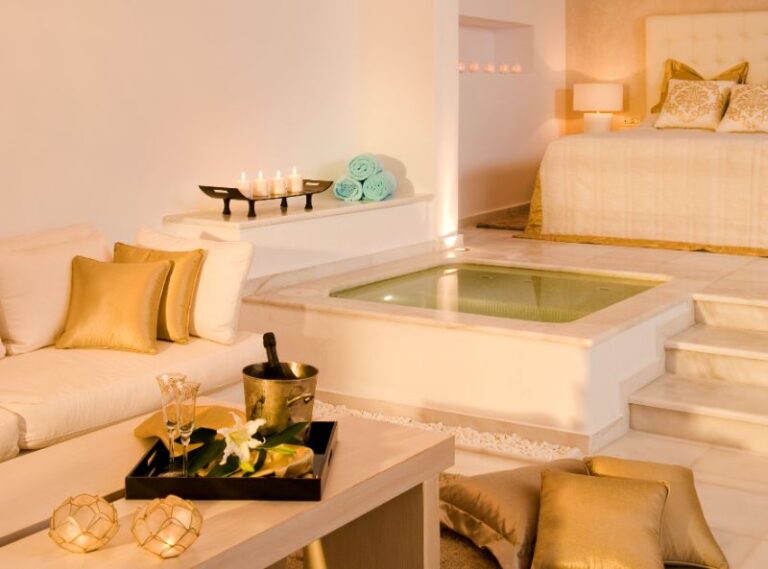 Set on the highest point in Imerovigli, 300 meters above the sea level, lying amidst the stunning volcanic scenery and with legendary sunsets where the deep blue sea meets the cloudless sky, Gold Suites is a sanctuary of romance. With stunning views of the caldera, legendary crimson sunsets, suites with private balconies, a pool bar and exquisite outdoor dining, this is the way to experience the beauty of the Aegean. Each of the 14 suites are wonderfully spacious with Gold and White décor that complements the Cycladic-style architecture.