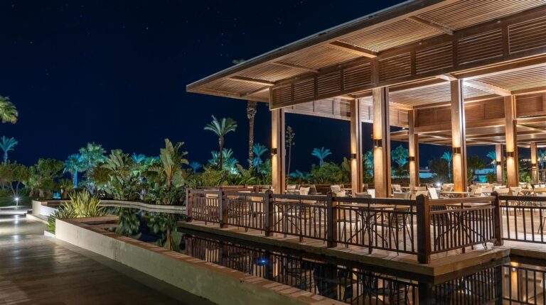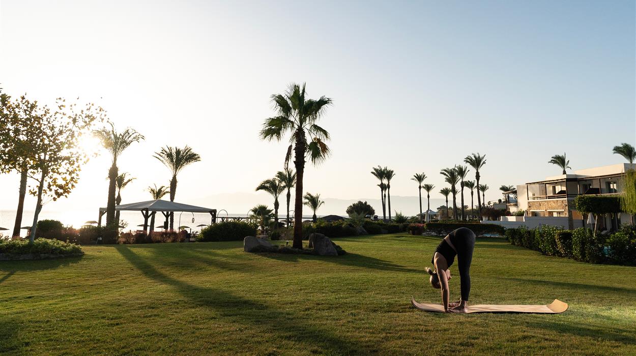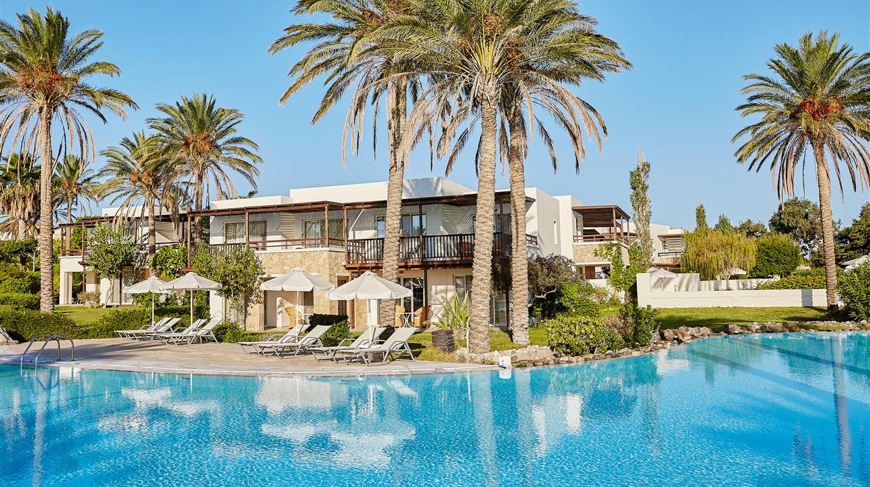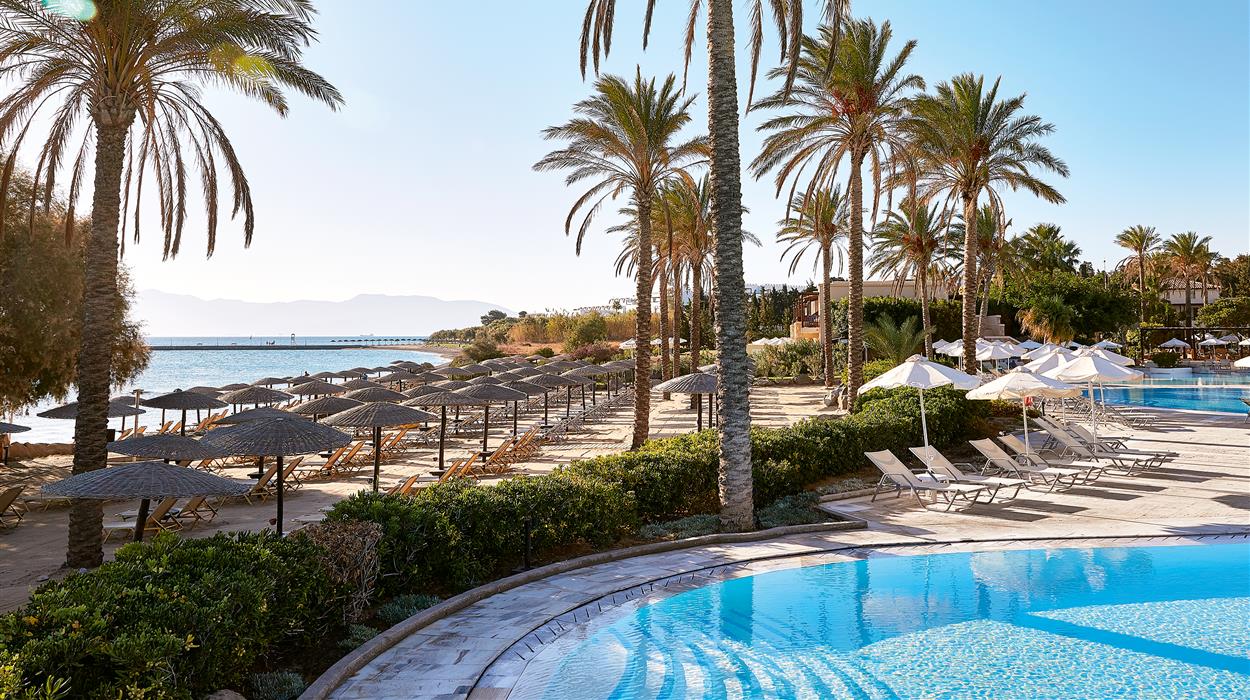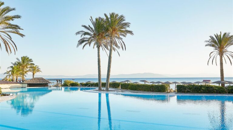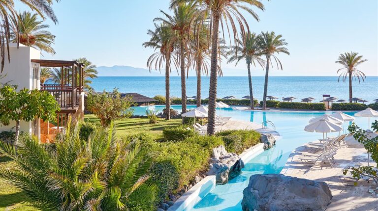 Situated directly on Psalidi Beach, Grecotel LUXME Kos offers stunning views of the Aegean Sea and is set amidst beautifully landscaped gardens filled with palm trees, your very own jungle in the Aegean. This luxurious 5-star resort is an excellent family-friendly hotel offering a wide range of activities, facilities, and entertainment to cater to all guests. The large main pool features a lazy river, while the peaceful landscaped pools are filled with seawater. The Elixir Spa provides a lavish sanctuary for indulgent pampering, and GrecoLand offers entertainment and organised activities for children and teenagers. The hotel boasts an extensive variety of dining venues and drink offerings, featuring four exquisite à la carte restaurants, two pool bars, one beach bar, and two stylish lobby bars, all available throughout the day and night.