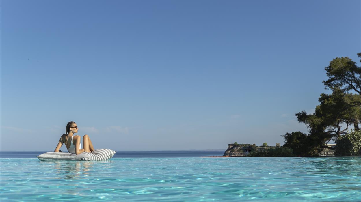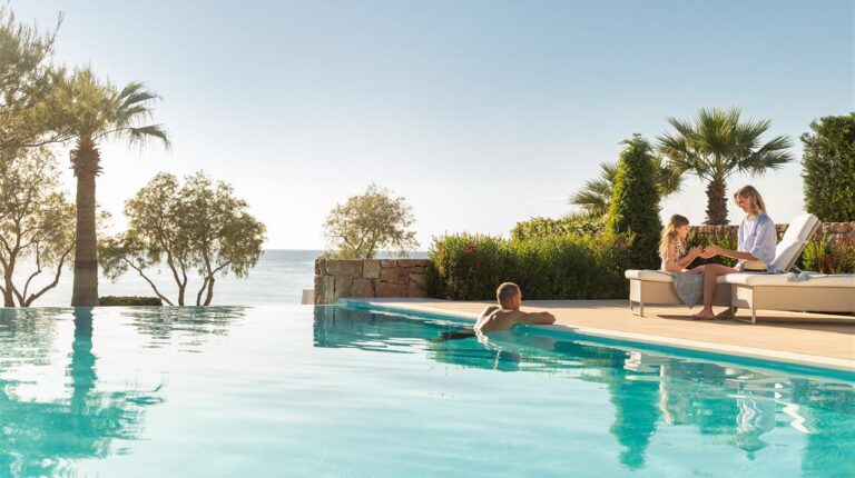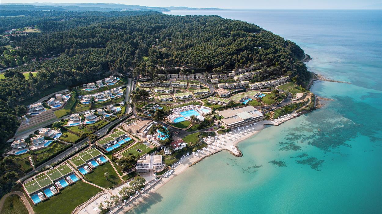 The Sani Club offers 253 contemporary bungalows with stunning views of the Aegean Sea, Mount Olympus, and lush gardens. Room options include private pools, private gardens, or balconies, with spacious rooms such as Double rooms, Junior Suites, Family Suites, One-bedroom, and Two-bedroom Bungalow Suites with private pools or gardens. Rooms feature Wi-Fi, TV, Bluetooth speakers, air conditioning/heating, minibar, coffee/tea/water, safety box, hairdryer, bathrobe/slippers, and Anne Semonin luxury bath amenities.