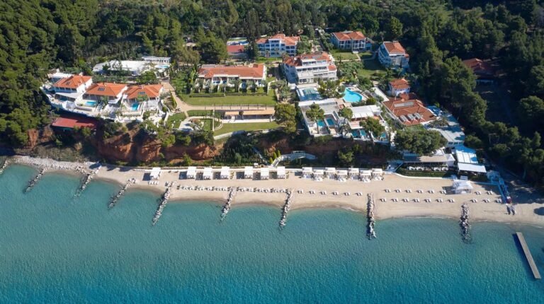 Established in 1975, The Danai was converted into a hotel by the two owners, Mrs. Danai and Mr. Otto Riefenstahl, who still oversee the 56 individually-designed suites and villas to this day. Each is elegantly designed with strong attention to detail, pristine white colours and traditional furniture establishing a warm and welcoming appearance, while the ocean views are a sight to behold. There is direct access to over 300 metres of private beach and plenty of shade to escape the elements. Other onsite experiences include the spa and fitness centre and the Bird Yachting, where you discover the hidden coves of Sithonia by boat