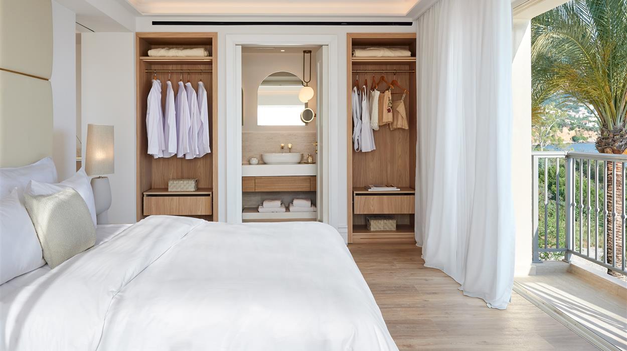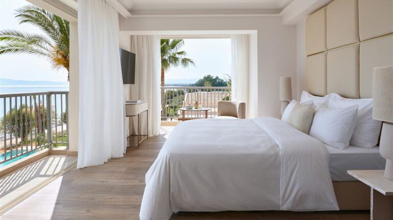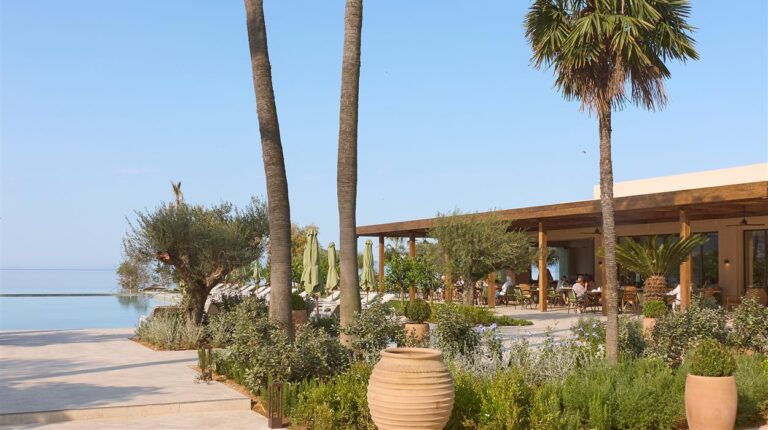 The opulent Grecotel Filoxenia is located on the outskirts of Kalamata in the Peloponnese region of Greece, at the base of the magnificent Taygetos Mountains. Exotic grounds encircle the building and border a stunning pebble beach in the Messinian Gulf. The hotel has three pools, including an outdoor pool, a kids pool, and an indoor pool with a hydromassage tub. It also has stunning rooms with amazing views, fine dining and gourmet cuisine. With a tennis court, spa and kids activities for young children and teenagers on-site, the hotel makes for a perfect beach getaway for both couples and families.