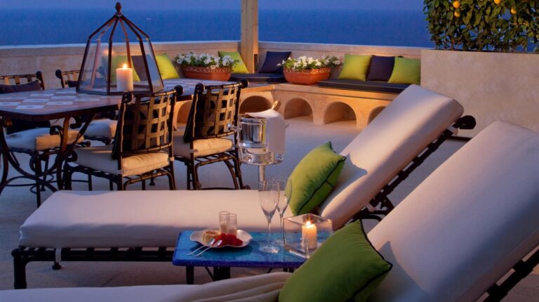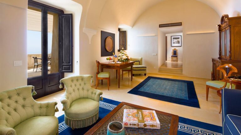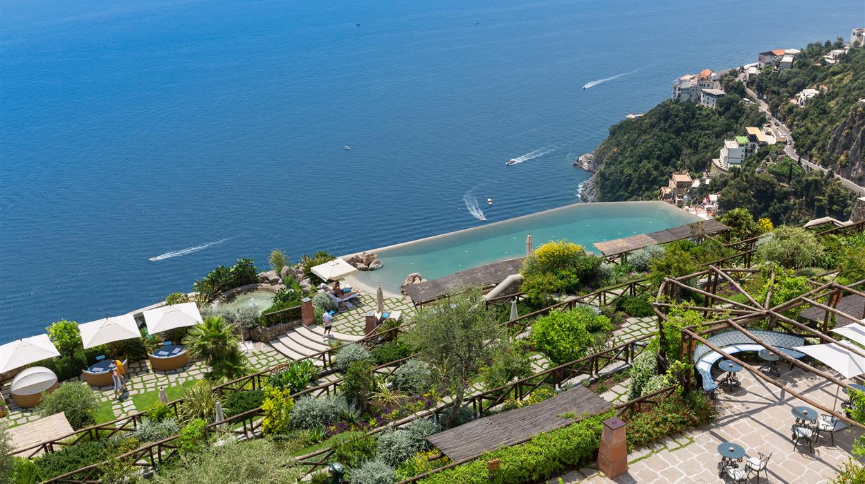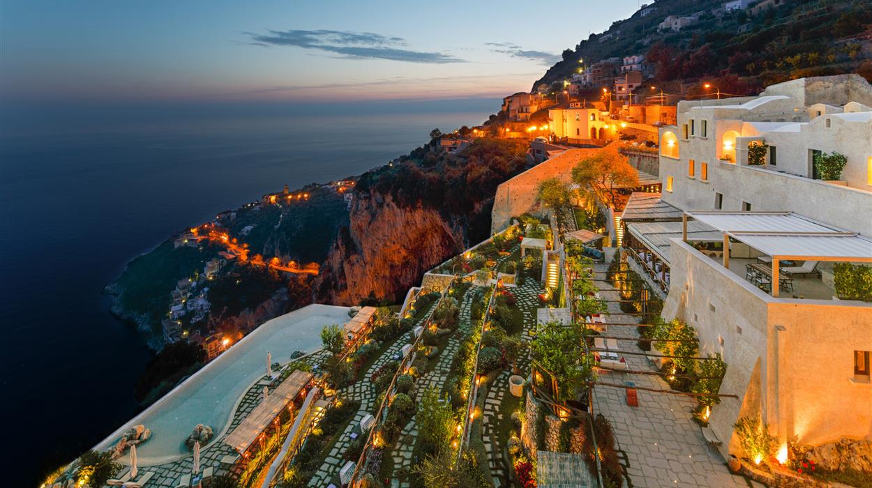 Originally a monastery built in the 17th century, Monastero Santa Rosa Hotel offers luxury Italian hospitality on the cliffside of the Amalfi coast. The two-level complex has 20 rooms and suites, each with window views of the sea and Conca dei Marini fishing harbor. The bathrooms offer luxury amenities including heated floors and rain-head showers. Inspired by traditional and contemporary Campanian cuisine, the Michelin-starred kitchen offers a memorable a la carte dining experience with fresh seafood and local produce.