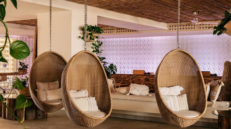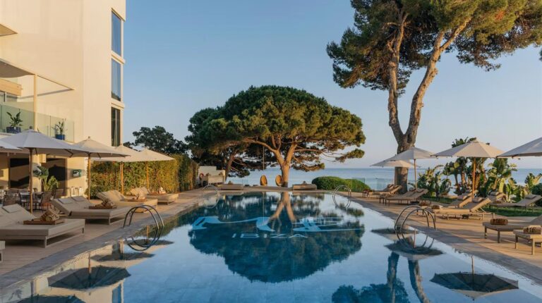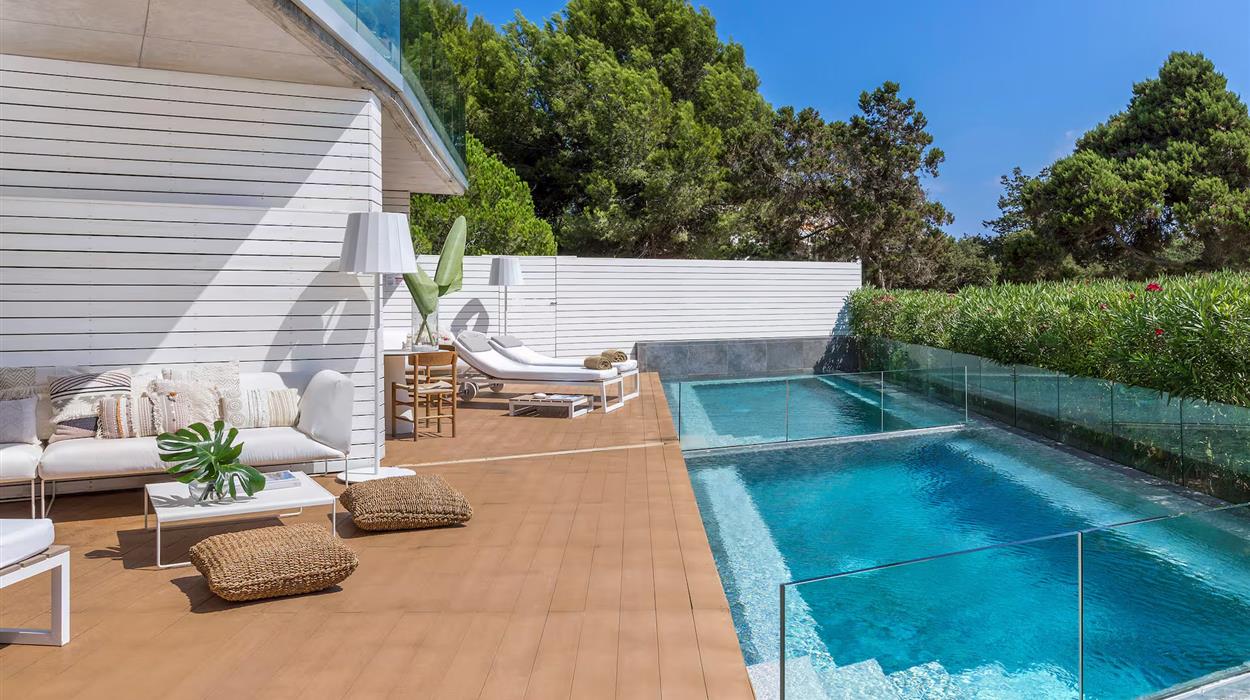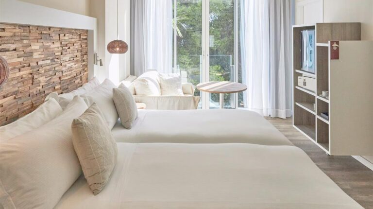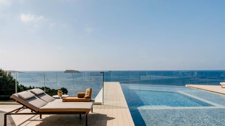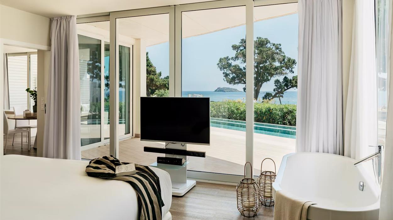 ME Ibiza is a 5-star beachside retreat located in a secluded bay, with magnificent panoramic sea views, relaxing outdoor lounge areas, and an enviable Mediterranean atmosphere. There are 15 room categories, and each one has Ibiza-style decor with hardwood flooring and an extensive minibar. The onsite dining venues offer a mix of Mediterranean and Italian cuisine, as well as comfortable indoor and outdoor dining settings. The RADIO Rooftop is the perfect way to enjoy 360° views of the beaches and sea.
