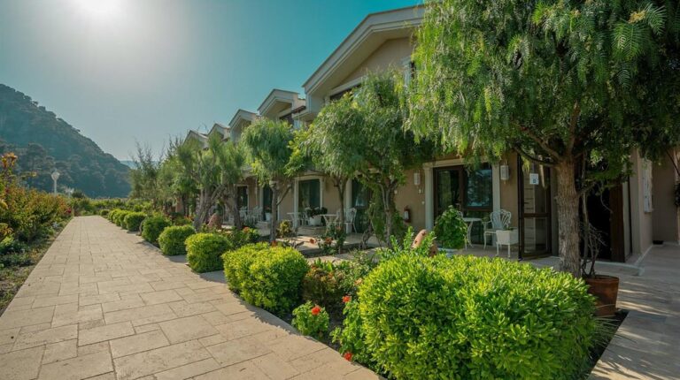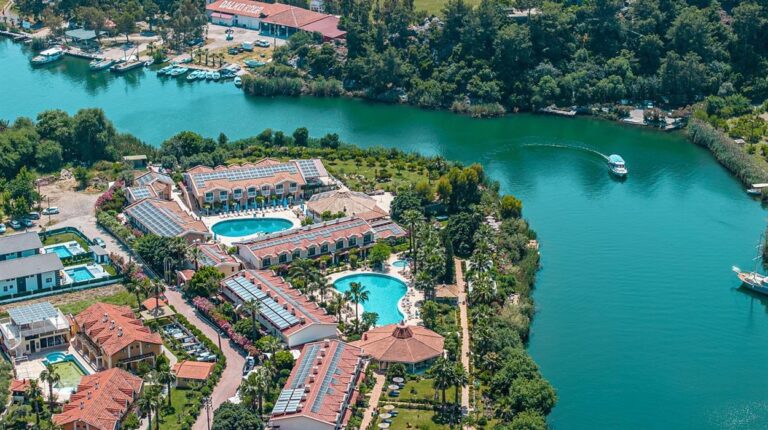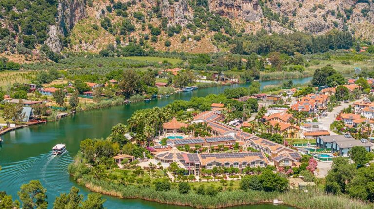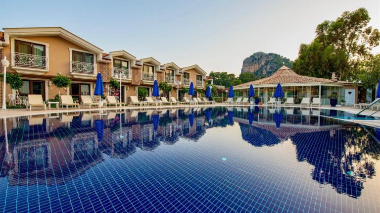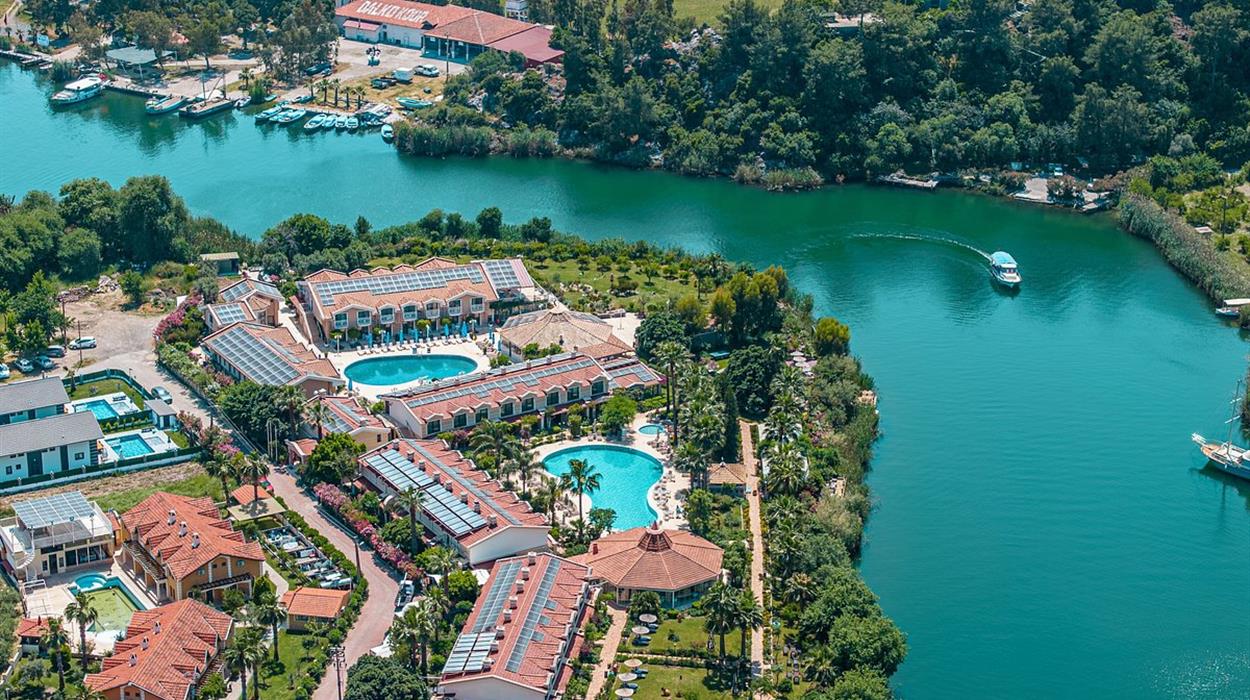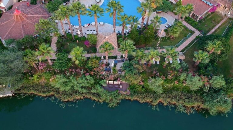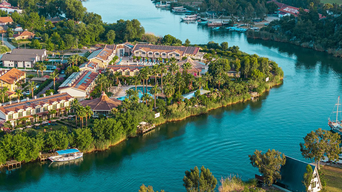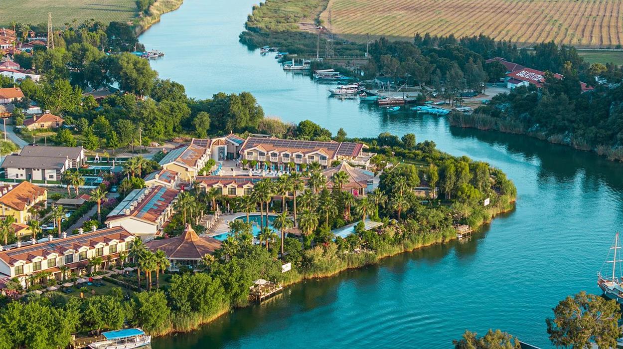 Dalyan Resort Spa Hotel is a 5-star tropical resort in Dalyan, Turkey. Surrounded by Lycian Rock Tombs and Calbys River, the hotel is in proximity to Iztuzu Beach and offers panoramic sea views. There are 42 available rooms, each one with poolside and riverside views, including air conditioning, a writing desk, and a 32 LED TV. Staying true to its bed & breakfast roots, the hotel offers a daily buffet breakfast full of classic Turkish cuisine.