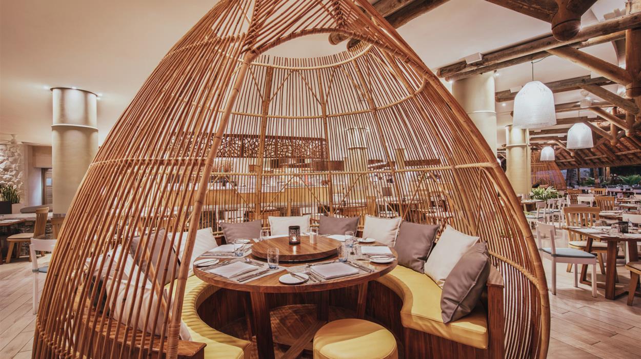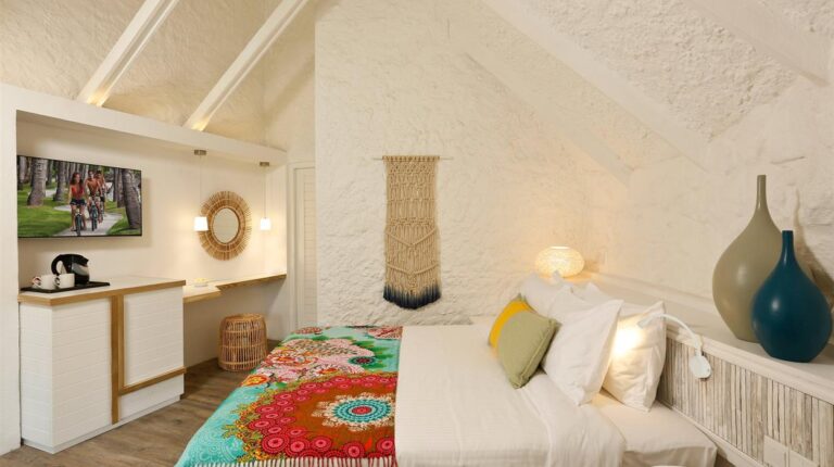 Inspired by traditional fishing boats, the resorts thatched-roof bungalows are thoughtfully designed to blend seamlessly with the natural surroundings. Each bungalow provides a private sanctuary, opening onto verdant gardens or the pristine white-sand beach, allowing guests to immerse themselves in the tranquil beauty of the island.