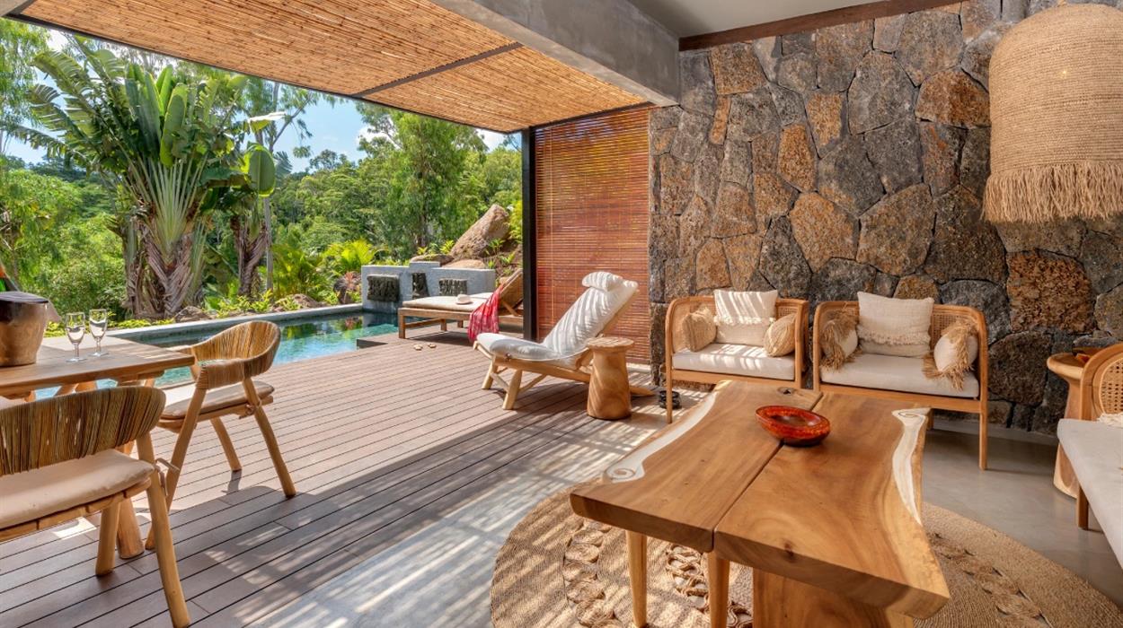 The lodge features 20 uniquely designed rooms and suites that showcase Mauritius rich cultural heritage, incorporating African, Asian, and European influences. Guests can relax in spacious accommodations that boast open-air showers, private terraces, and, in some suites, private plunge pools with stunning views of the nearby mountains or the distant ocean.
