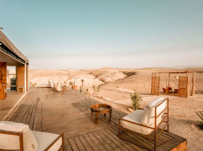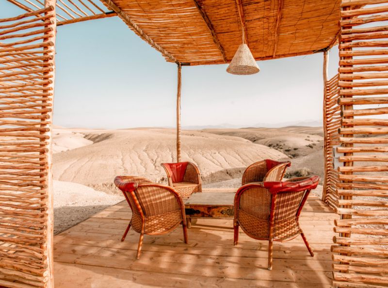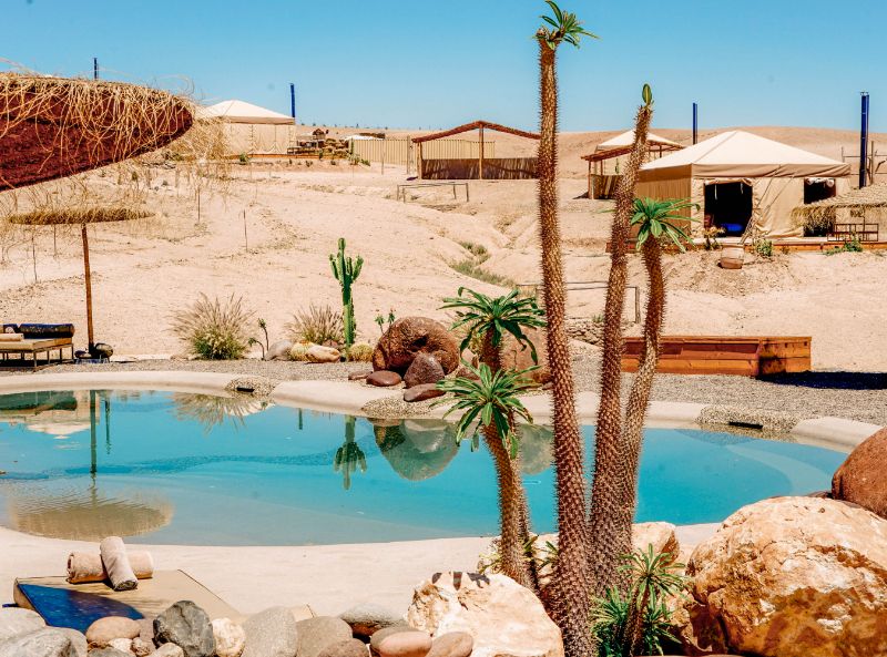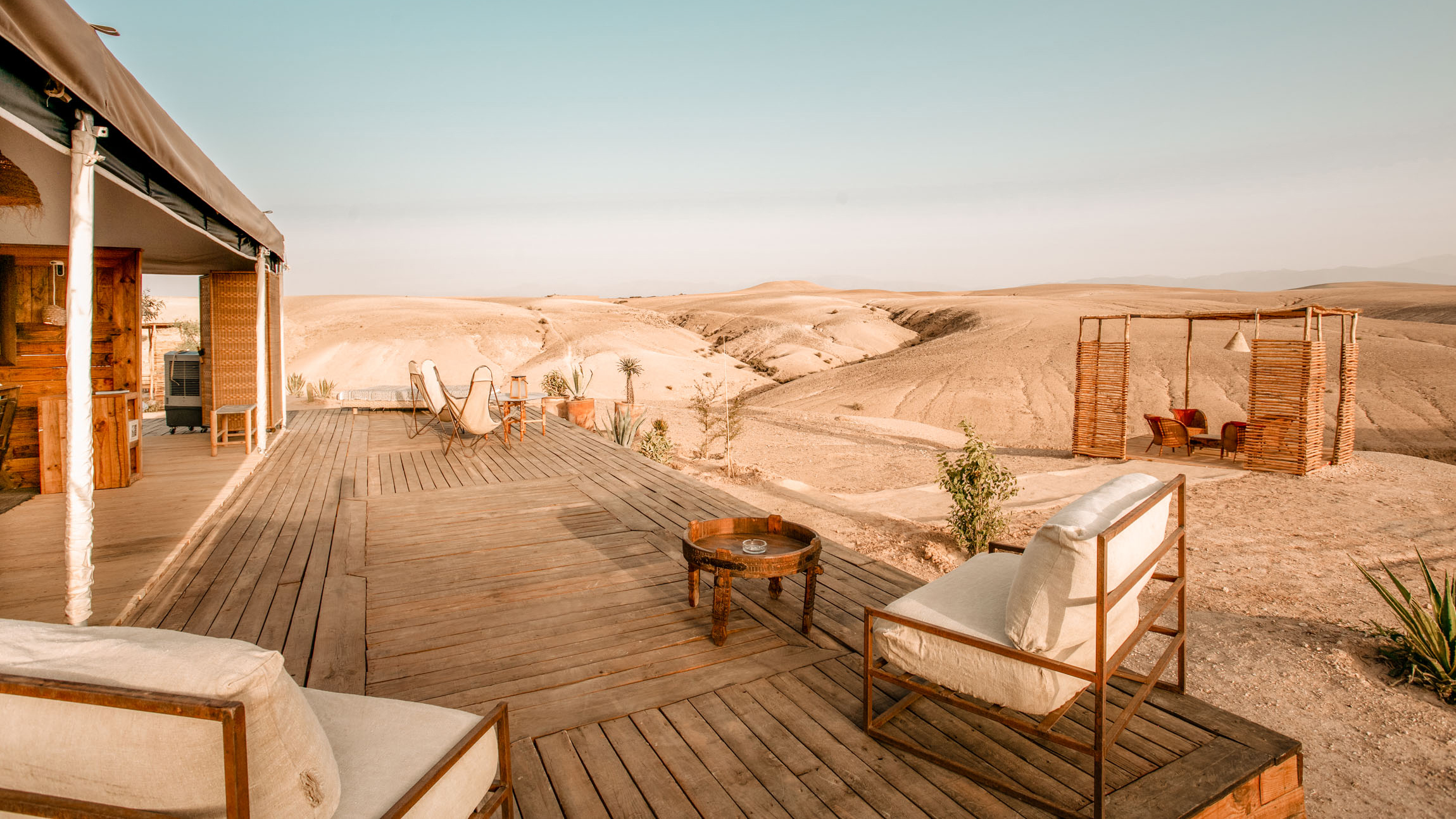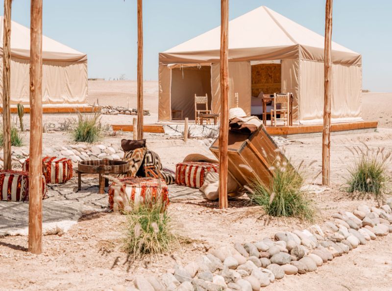 Inara Camp is a remote haven for an authentic desert camp experience, situated in the Agafay desert just outside Marrakech. Here, you can take a camel or buggy ride and spend the night in a berber tent beneath the stars. The camp is divided into two sections over 10-hectares: the top portion hosts the restaurant, which welcomes visitors for an amazing meal, whilst the lower portion is the bivouac area, home to 18 30sqm grand tents – each with a king-size bed, living area and separate bathroom with shower (hot water) and toilet – the ideal place to experience the one-of-a-kind experience of spending the night under the desert skies. The camp maintains a sense of privacy and absolute bliss amidst truly spectacular landscapes. The Inara Camp is the ideal Moroccan camp experience, where you can combine a romantic getaway under the stars with an adventurous desert experience during the day, thanks to the abundance of cultural and sporting activities on offer.
