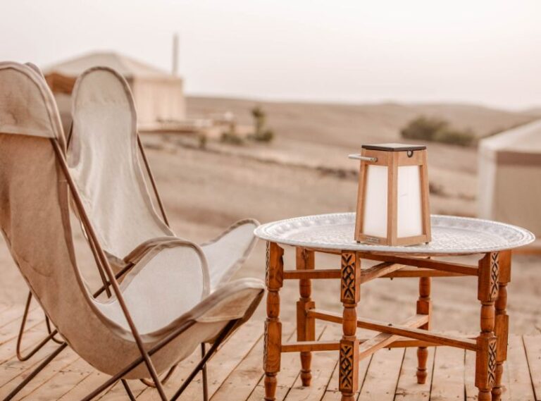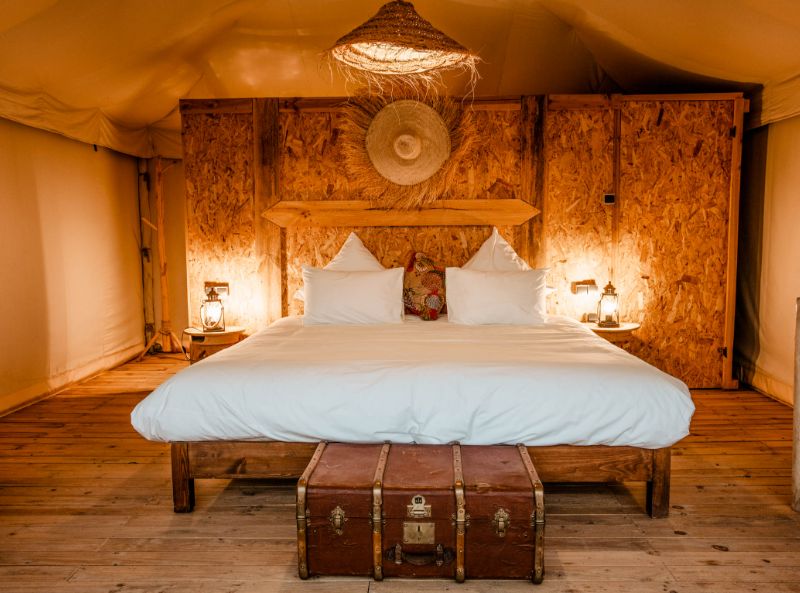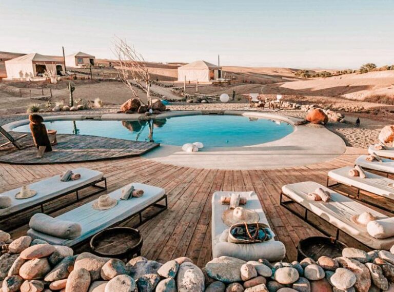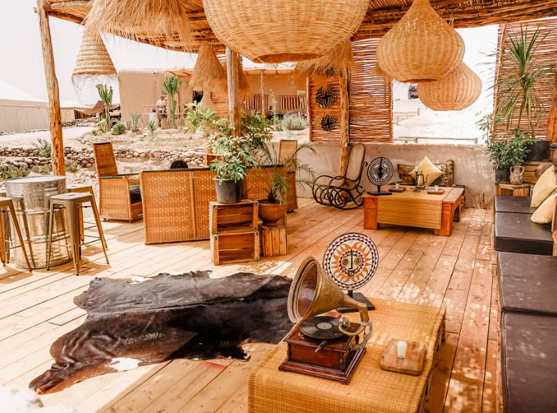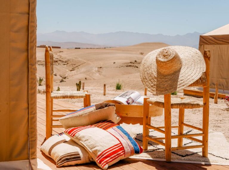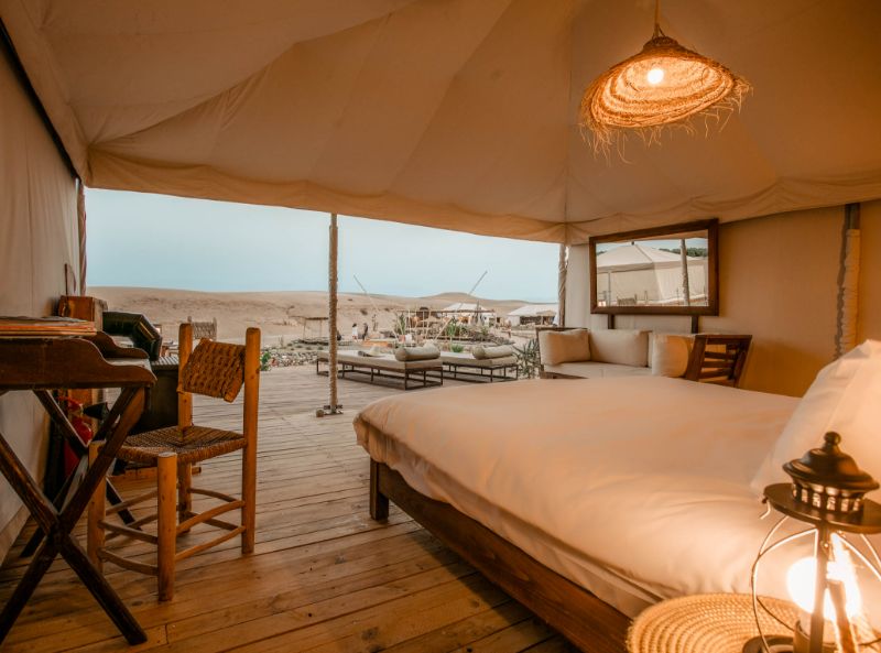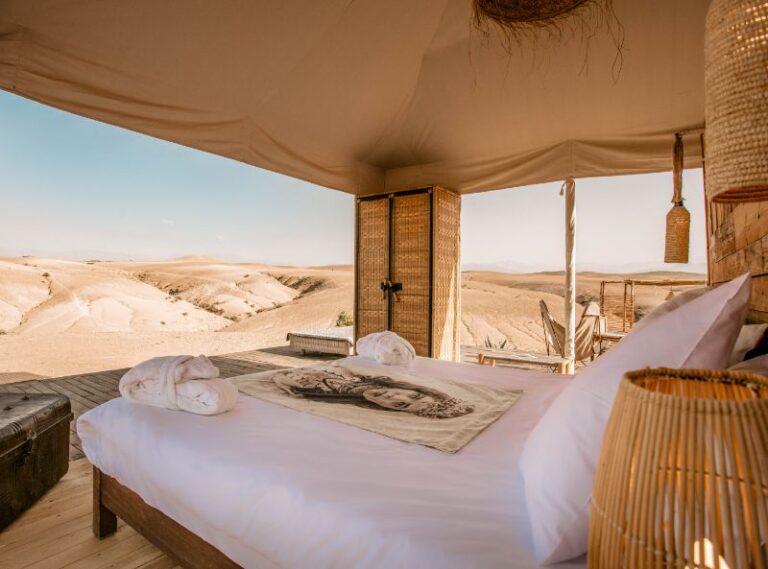 Inara Camp is a remote haven for an authentic desert camp experience, situated in the Agafay desert just outside Marrakech. Here, you can take a camel or buggy ride and spend the night in a berber tent beneath the stars. The camp is divided into two sections over 10-hectares: the top portion hosts the restaurant, which welcomes visitors for an amazing meal, whilst the lower portion is the bivouac area, home to 18 30sqm grand tents – each with a king-size bed, living area and separate bathroom with shower (hot water) and toilet – the ideal place to experience the one-of-a-kind experience of spending the night under the desert skies. The camp maintains a sense of privacy and absolute bliss amidst truly spectacular landscapes. The Inara Camp is the ideal Moroccan camp experience, where you can combine a romantic getaway under the stars with an adventurous desert experience during the day, thanks to the abundance of cultural and sporting activities on offer.