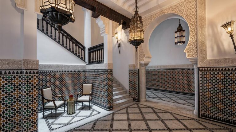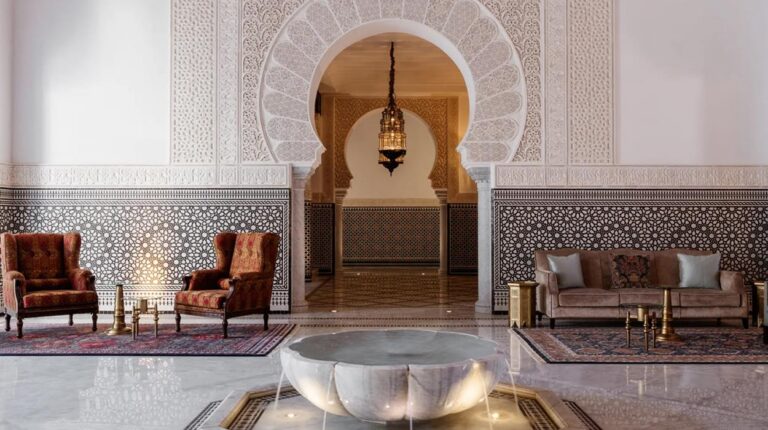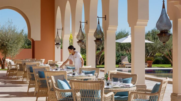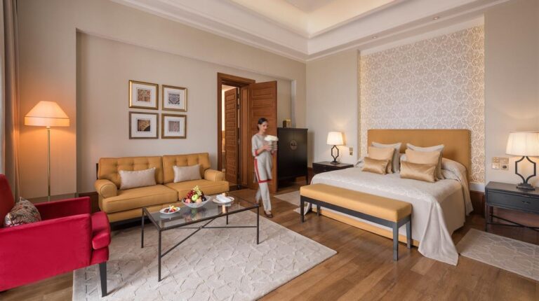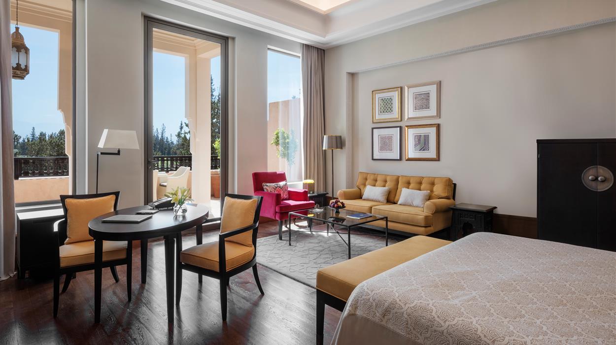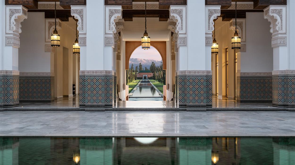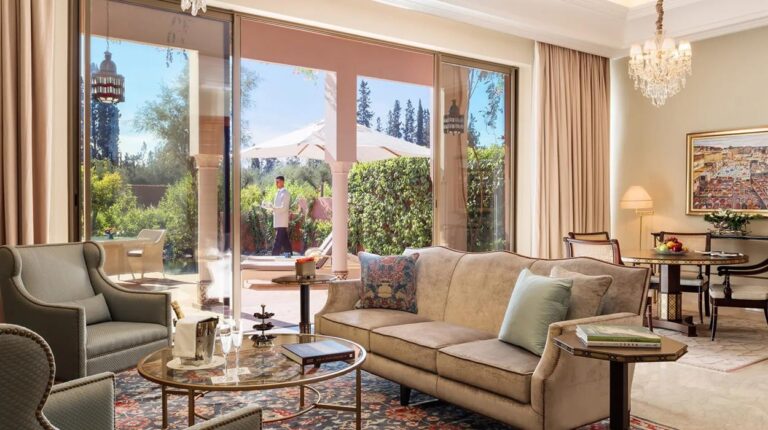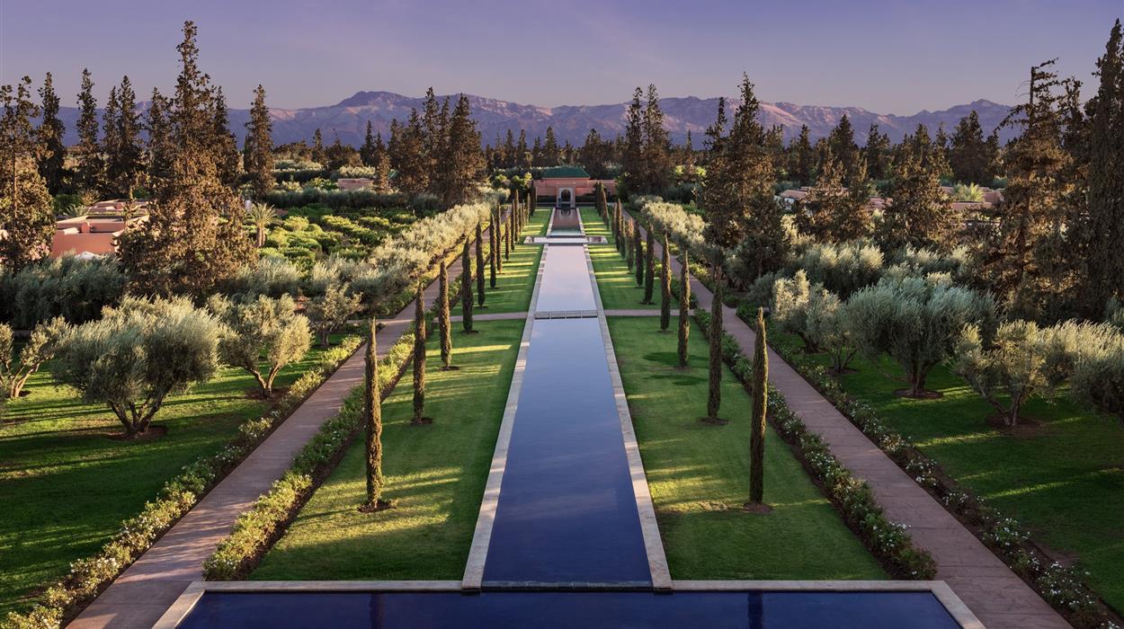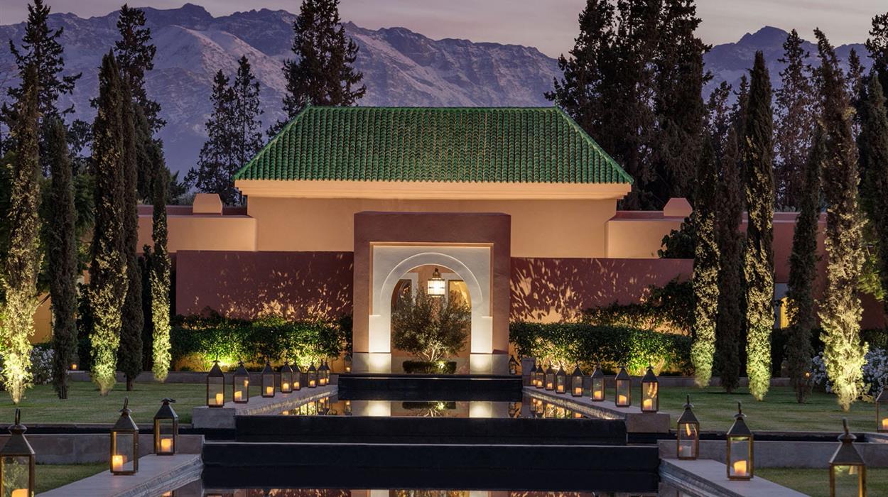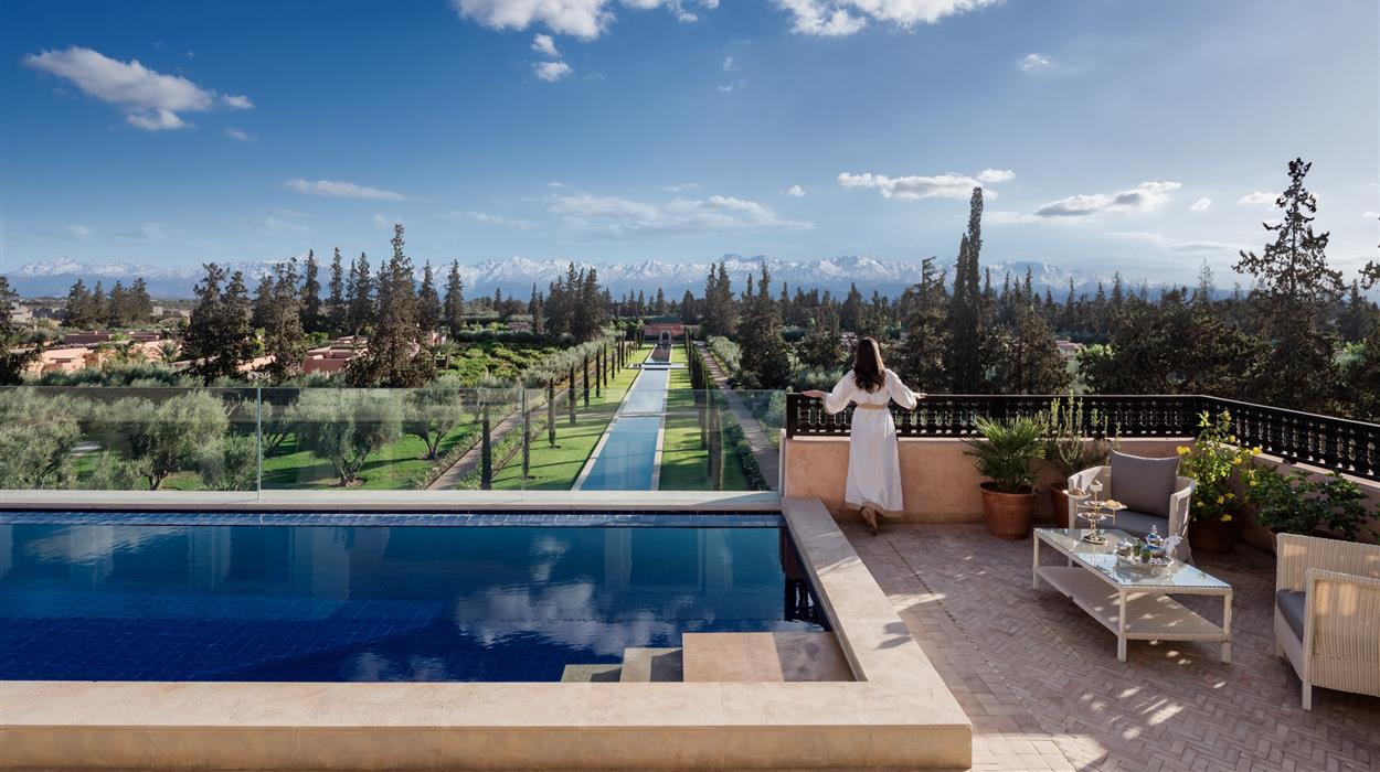 The Oberoi, Marrakech is a grand luxury resort set within 28 acres of landscaped gardens, olive groves, and water features, with views towards the Atlas Mountains. The resort offers 84 spacious rooms, suites, and private villas, each inspired by traditional Moroccan architecture with modern touches. Accommodation includes Deluxe Rooms with private terraces, expansive suites, and private pool villas featuring enclosed gardens and heated pools. Interiors highlight handcrafted details, high ceilings, and elegant marble bathrooms with deep soaking tubs and walk-in rain showers. All accommodations include air conditioning, complimentary Wi-Fi, flat-screen TVs, espresso machines, minibars, electronic safes, plush bedding, bathrobes, and slippers, providing a serene and indulgent retreat.